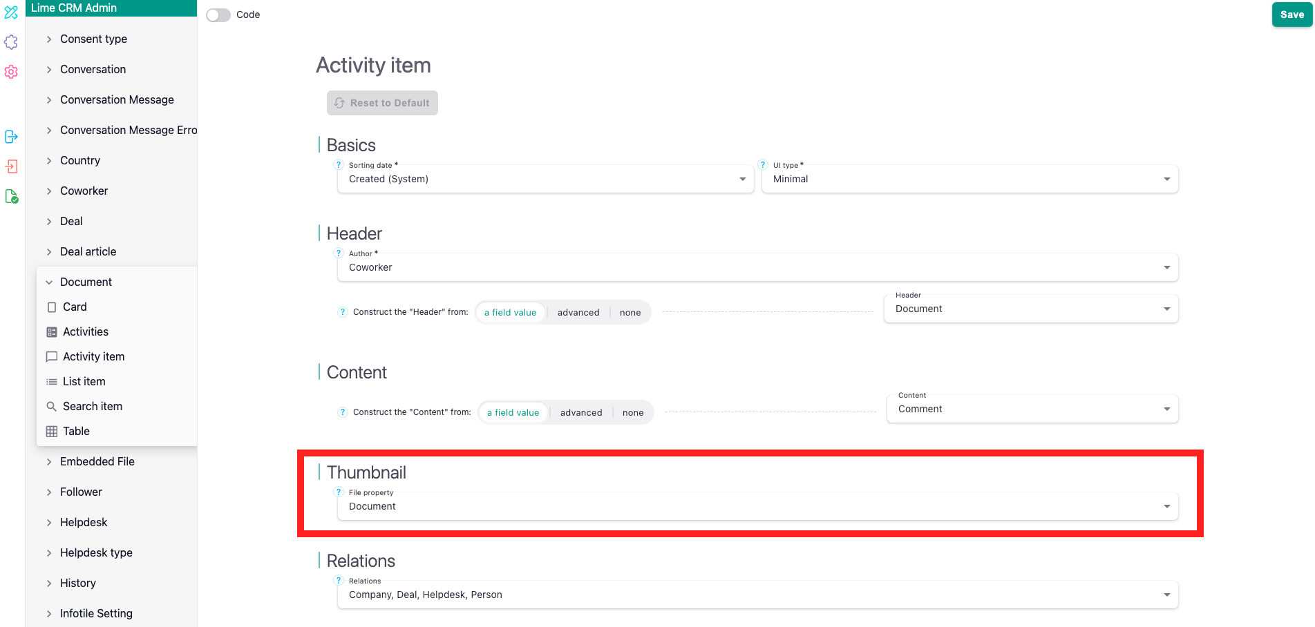Go to the Activity item view in Lime Admin to configure how you want your activity items for a desired limetype to be displayed in the Activities timeline.