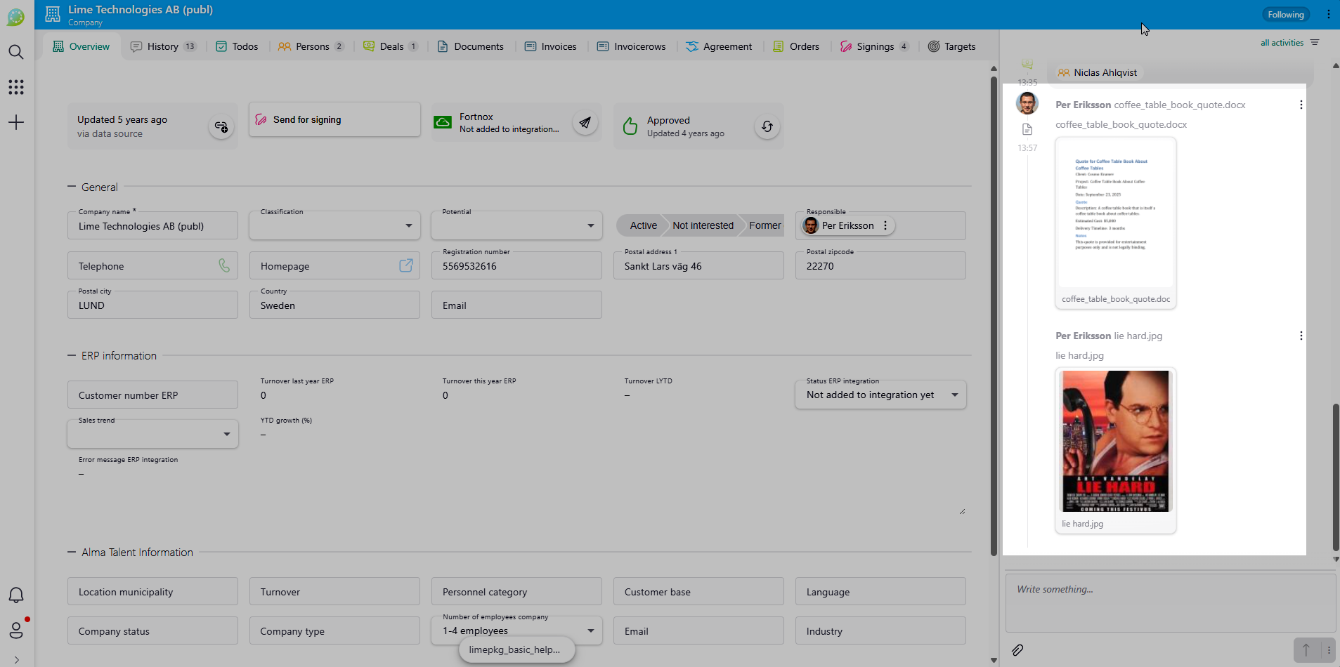 Activities is a timeline, showing everything that has happened on a record. It is a good way to quickly and easily see everything that has happened on a customer, deal or any other record recently. Activities does not only show history notes but also email, documents, tickets, you-name-it! The timeline is displayed to the right in the Split View, and items of different limetypes can easily be shown by using the filter selection at the top. A Composer is shown at the bottom, making it easy to create history content straight in the timeline. In the future, it will be possible to create any content with your own composer.
