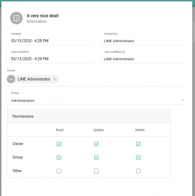 Every object in lime, independent of type, is assigned an owner, a group and a set of permissions. The permissions are separated into three different contexts: