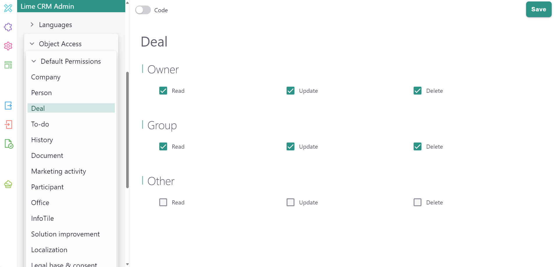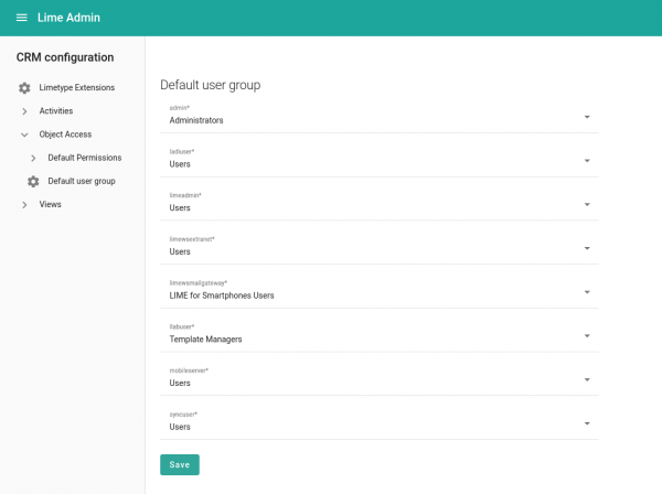 The configuration of object access is done through Lime Admin in the "CRM configuration" category under "Object access". Here you can set the default permissions for each limetype as well as set the default group for each user.