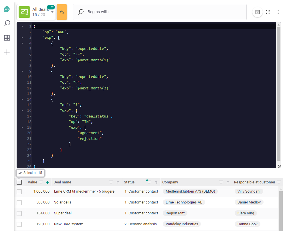 Each filter is represented in the webclient in the form of a JSON. This filter is then passed to Lime Query to fetch the matching records. For advanced scenarios it is possible to edit this JSON structure directly by using the Filter Editor. The filter editor comes in handy when you want to create a filter that is not possible to achieve using column filters.