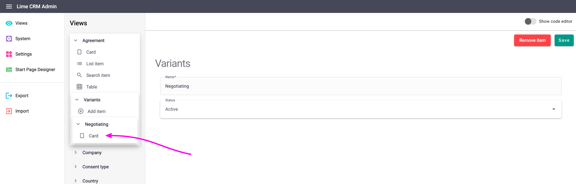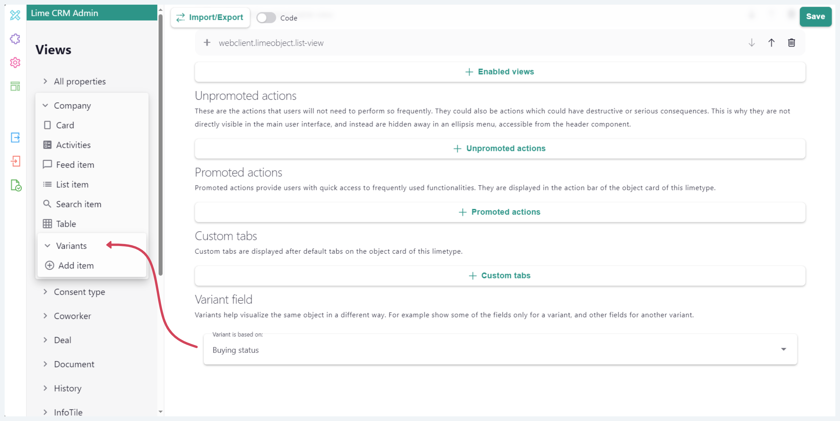 To enable variants for an object, navigate to Lime Admin > Views, and then click on the object of your choice. Then find the section called “Variant Field”. Pick the field which will be the decisive field of your variants. Only Options lists are supported to be used as the "Variant Field".