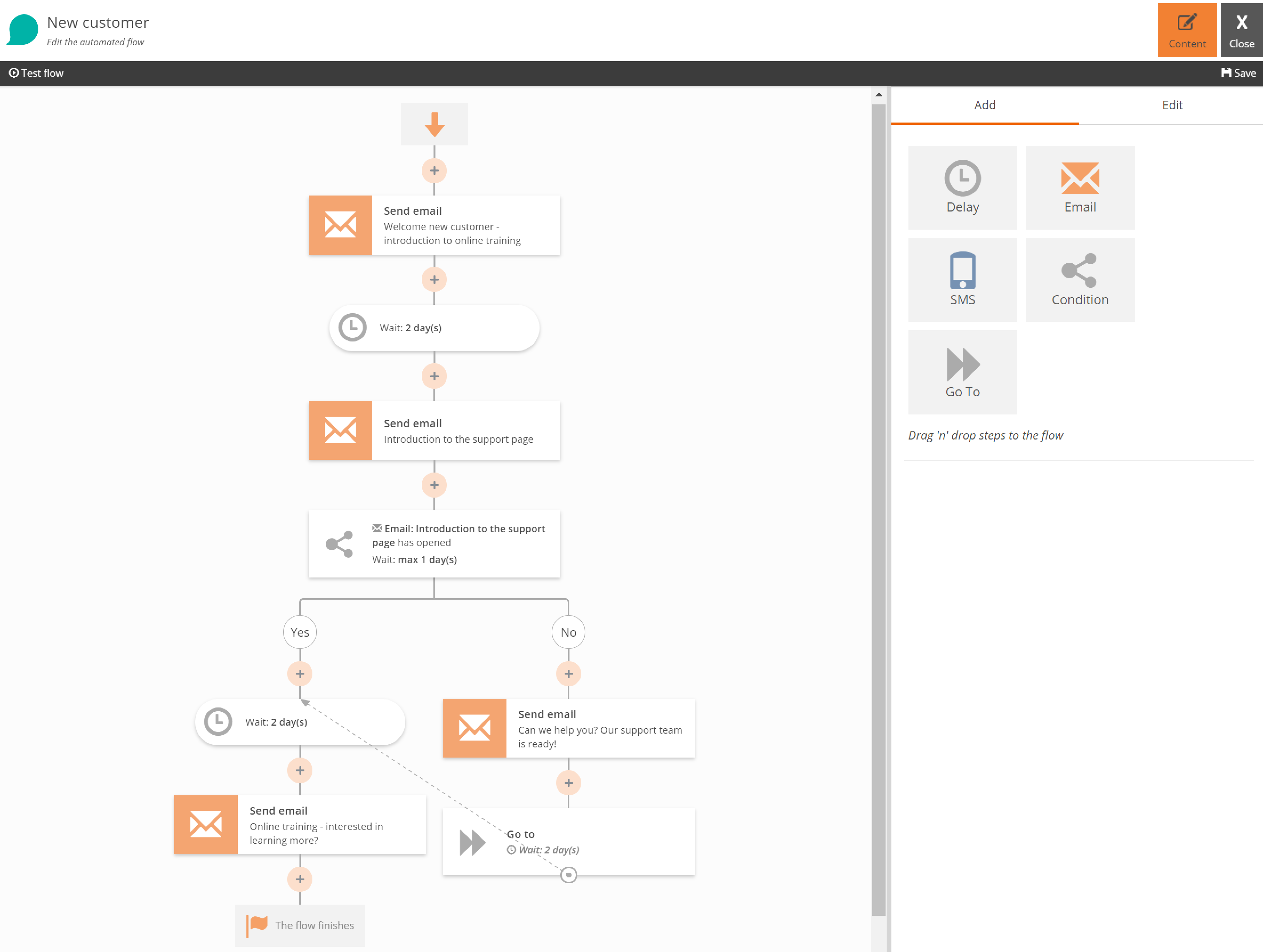 With the condition step it is possible to create logical branches in the flow. Participants will be directed down the yes-path or the no-path based on the evaluation of a specified condition. This is an example of a 'new customer' flow with a condition step: